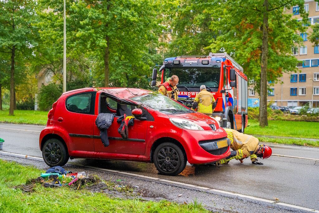 Een automobiliste is zondagmiddag op de Europa-allee in Kampen de macht over het stuur verloren en met haar auto over de kop geslagen. Ze kwam met de schrik vrij en raakte niet gewond.