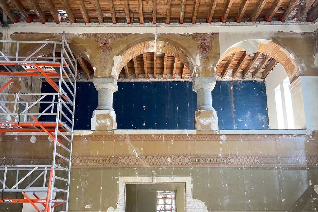 Het gebouw, dat na jaren leegstand wordt verbouwd tot 39 appartementen, bleek meer erfgoed te herbergen dan verwacht. In de grote aula zijn sjabloonschilderingen van de Kamper kunstenaar Egbert Jan Bruins aangetroffen. Die waren bekend, maar blijken deels beschadigd door eerdere moderniseringen.
