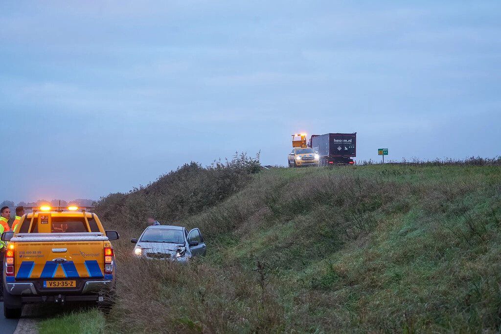 Een bergingsbedrijf heeft de beschadigde auto die onderaan het talud terechtkwam weggesleept. De andere auto liep lichte schade op.