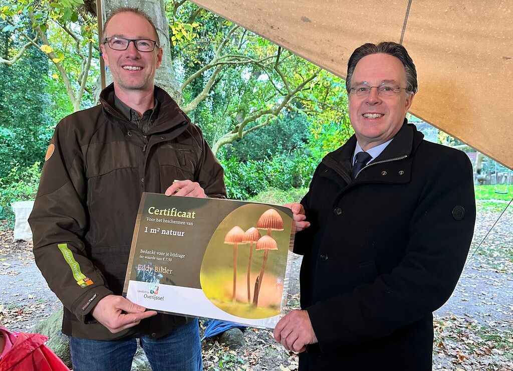 Namens Stichting Landschap Overijssel overhandigde directeur Ronald Krabbenbos de burgemeester symbolisch een certificaat voor één vierkante meter natuur. Voor iedere deelnemer wordt een bijdrage gestort in het Overijssels Natuurfonds, bedoeld voor de aankoop van nieuwe natuurgrond.