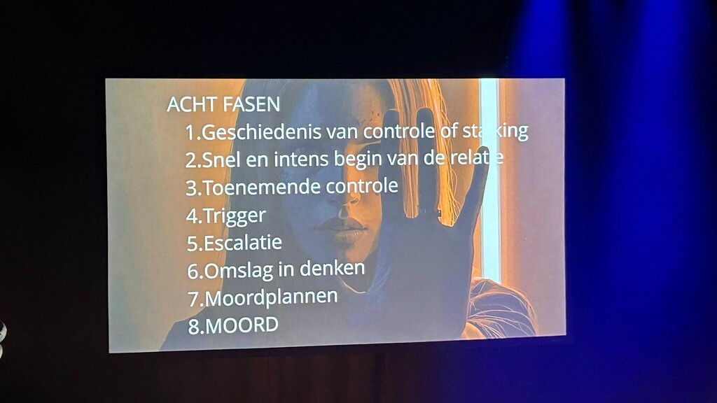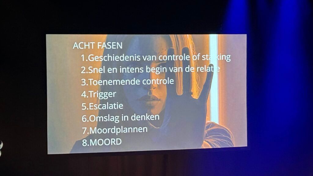 De avond werd geopend door voormalig journaalpresentator Sasha de Boer met de woorden dat femicide ‘de meest voorspelbare vorm van moord’ is. In een gesprek met Barbara Godwaldt specialist intieme terreur, wiens zus werd vermoord door haar partner, werden alle fasen die standaard voorafgaan aan een moord doorgenomen. Belangrijk, want zo kan de persoon zelf maar ook de omgeving het gevaar herkennen. Familie en vrienden kunnen aan de bel trekken als een vriendin of familielid steeds minder van zich laat horen bijvoorbeeld.