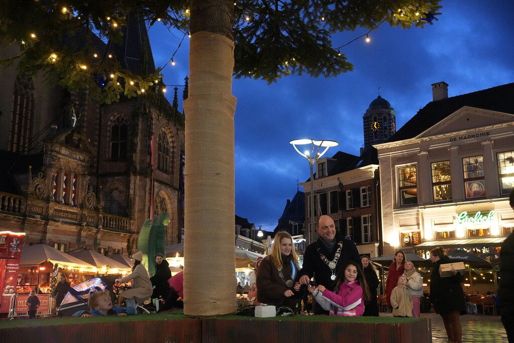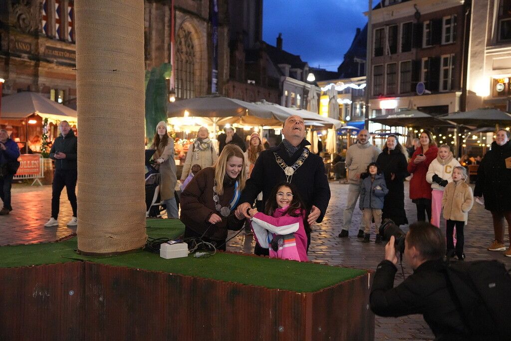Vanmiddag om 17.00 uur zijn de lampjes van de Kerstboom op de Grote Markt in Zwolle aangestoken. Deze officiële handeling werd verricht door de kinderburgemeesters van Zwolle, Eleonore en Melek. Samen met burgemeester Peter Snijders zetten ze de enorme boom in het licht. De boom is dit jaar geschonken door woningbouwvereniging Openbaar Belang.