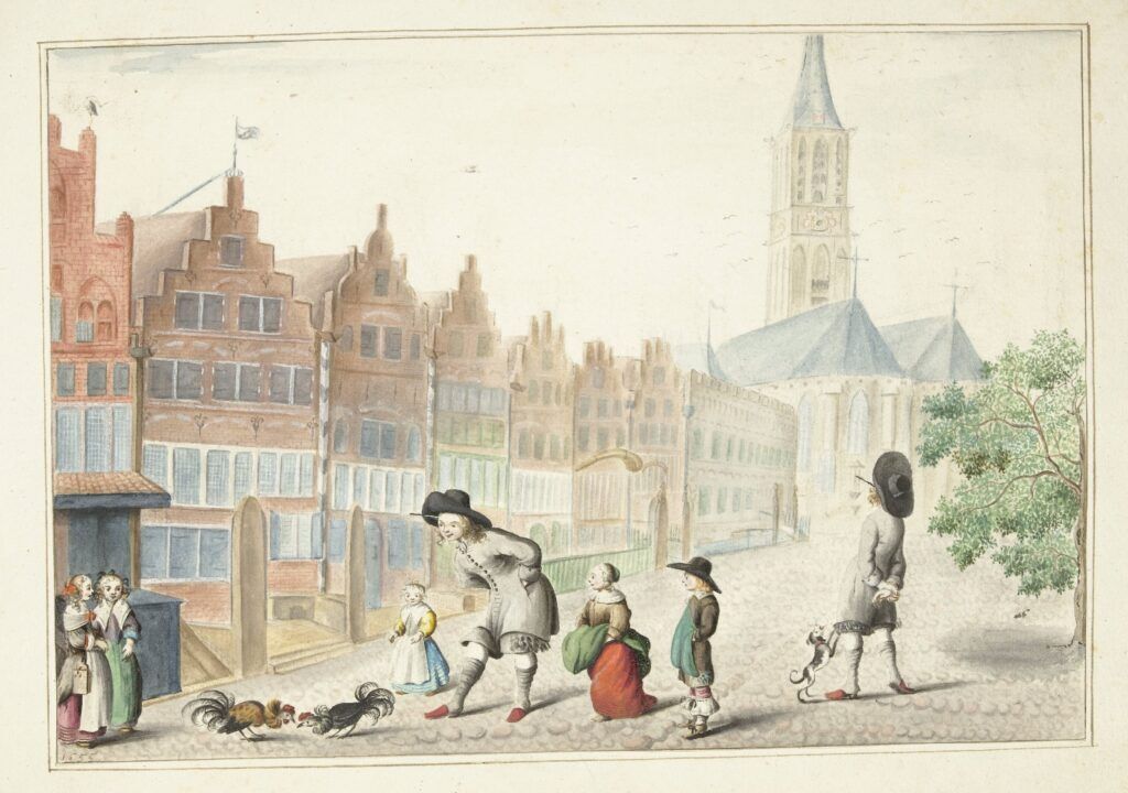 Vanuit de ramen op de derde verdieping is er een prachtig zicht op de witte stad. Voor de echte Zwollenaren is er een bonusvraag: op deze aquarel van Gesina ter Borch is een hanengevecht afgebeeld. In welke Zwolse straat speelt dit tafereel zich af?